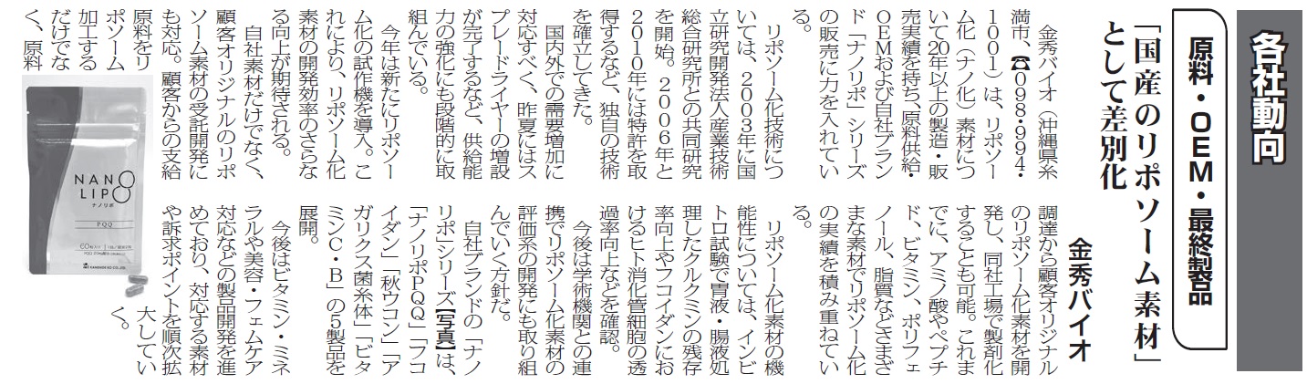 業界新聞ヘルスライフビジネス2025年12月15日(第865号)特集「リポソーム化素材・加工技術」14面、5面に弊社の記事が掲載されました。