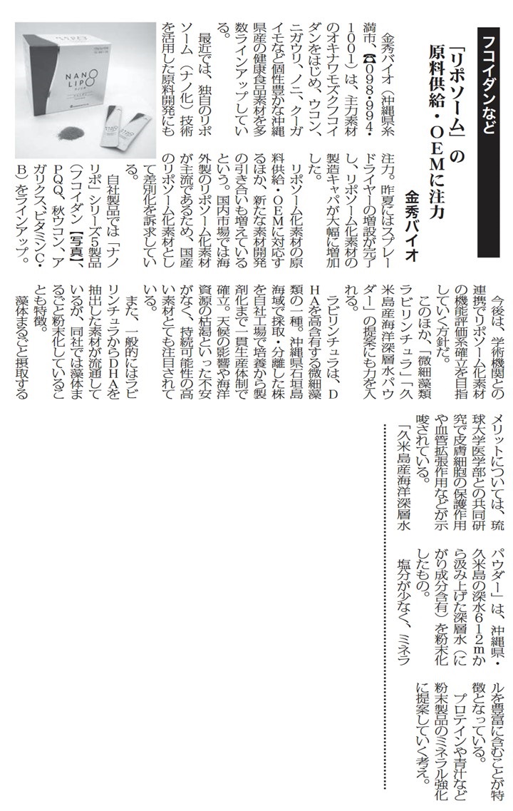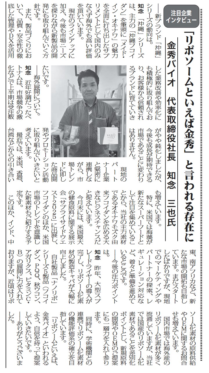 業界新聞ヘルスライフビジネス2025年10月15日(第861号)特集「沖縄県産健康素材」として、14面に各社動向、16面に弊社代表の知念のインタビュー記事が掲載されました。